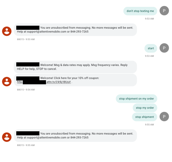For example, if a customer texts: “I would like to stop my order. Can you help me?,” this would not inaccurately unsubscribe the user.
